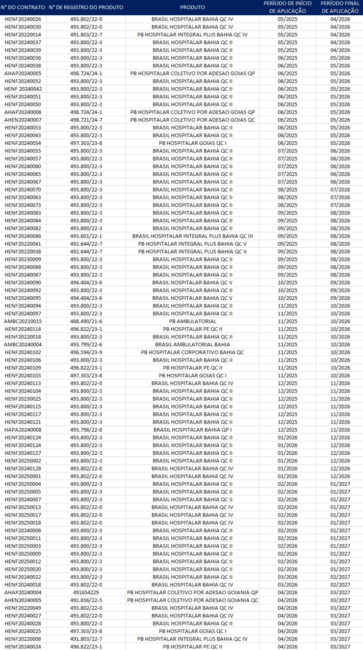 Em respeito aos nossos beneficiários e em cumprimento desta norma, comunicamos que o percentual de reajuste apurado para o novo ciclo foi de 12,7% para os contratos abaixo relacionados. A aplicação de reajuste é realizada no mês de aniversário do contrato entre maio 2025 e abril de 2026.